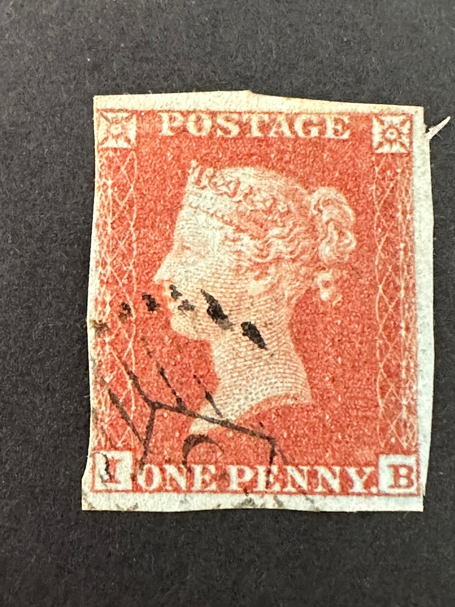 UK GB QV 1840 One penny red stars stamp, imperforate on bluish paper