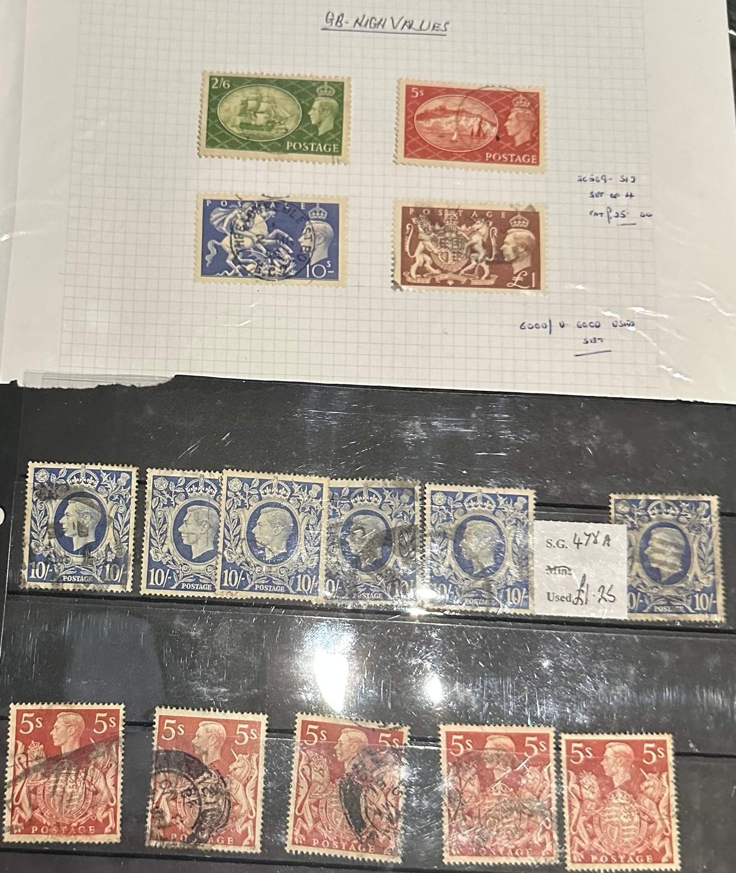 GB KGVI ex dealer’s stamps selection inc SG 509-12 set includes v good clear THREADNEEDLE ST cancel 10s stamp