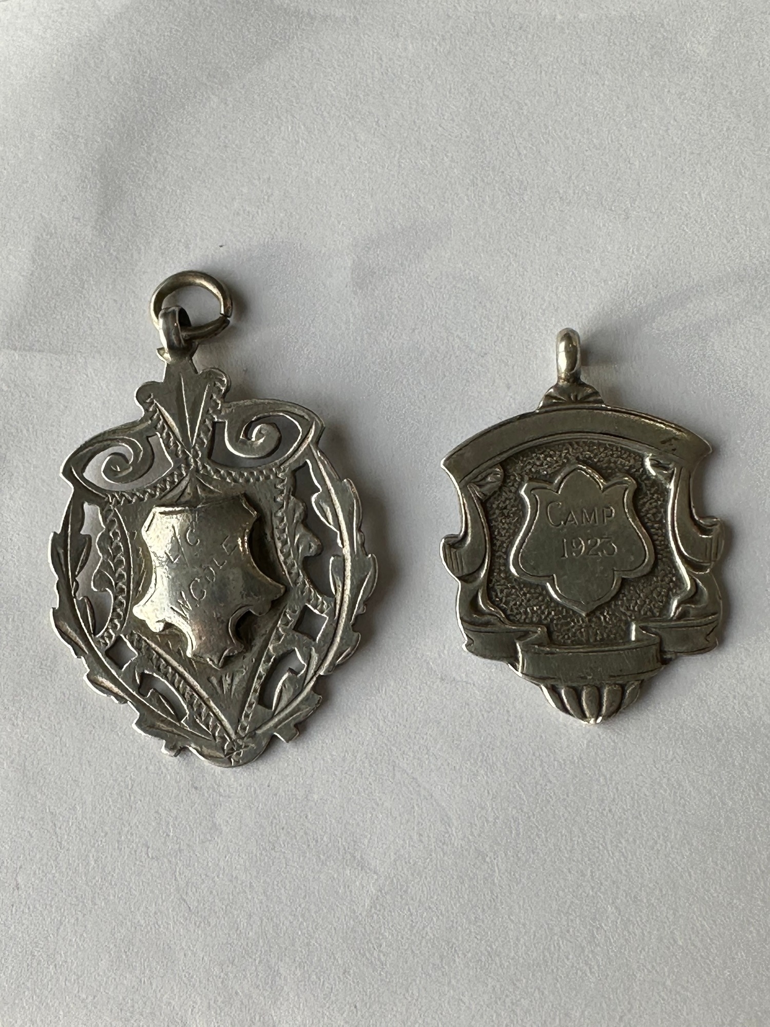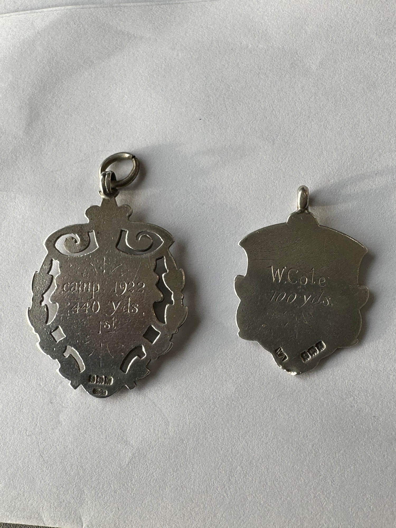 two antique hallmarked Birmingham silver fobs awarded for athletics – running from 1921 and 1922, Herbert Bushell & Sons Ltd and M Adams Ltd both engraved W Cole
