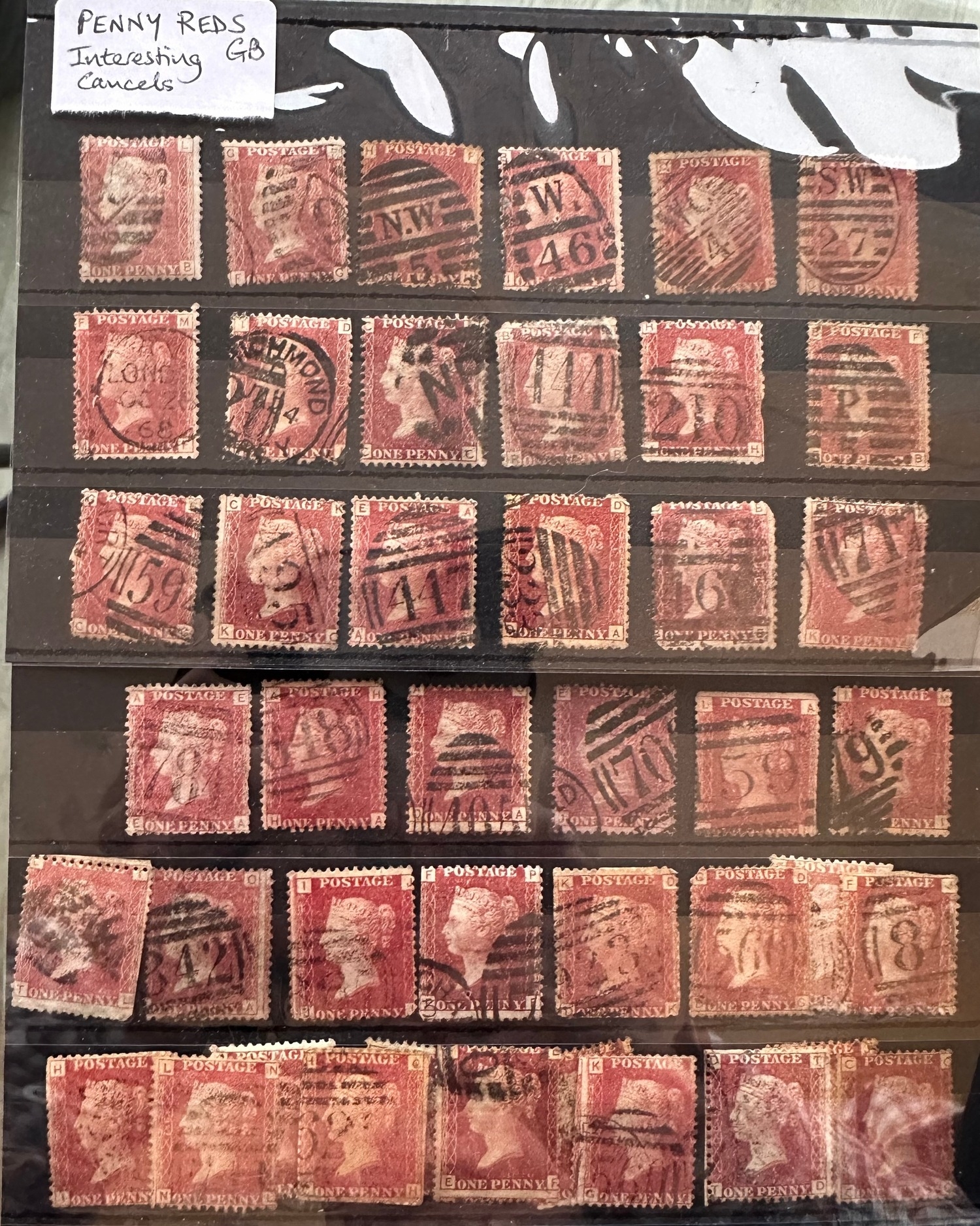 Penny red stamps selection on two stock cards, many interesting and clear cancels inc Richmond and quite a few London