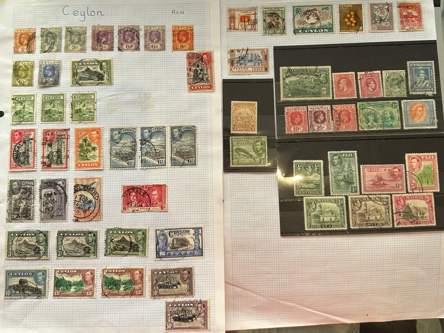 GB Commonwealth stamps selection on album page and stock cards, KGV, KGVI and QEII mainly Ceylon