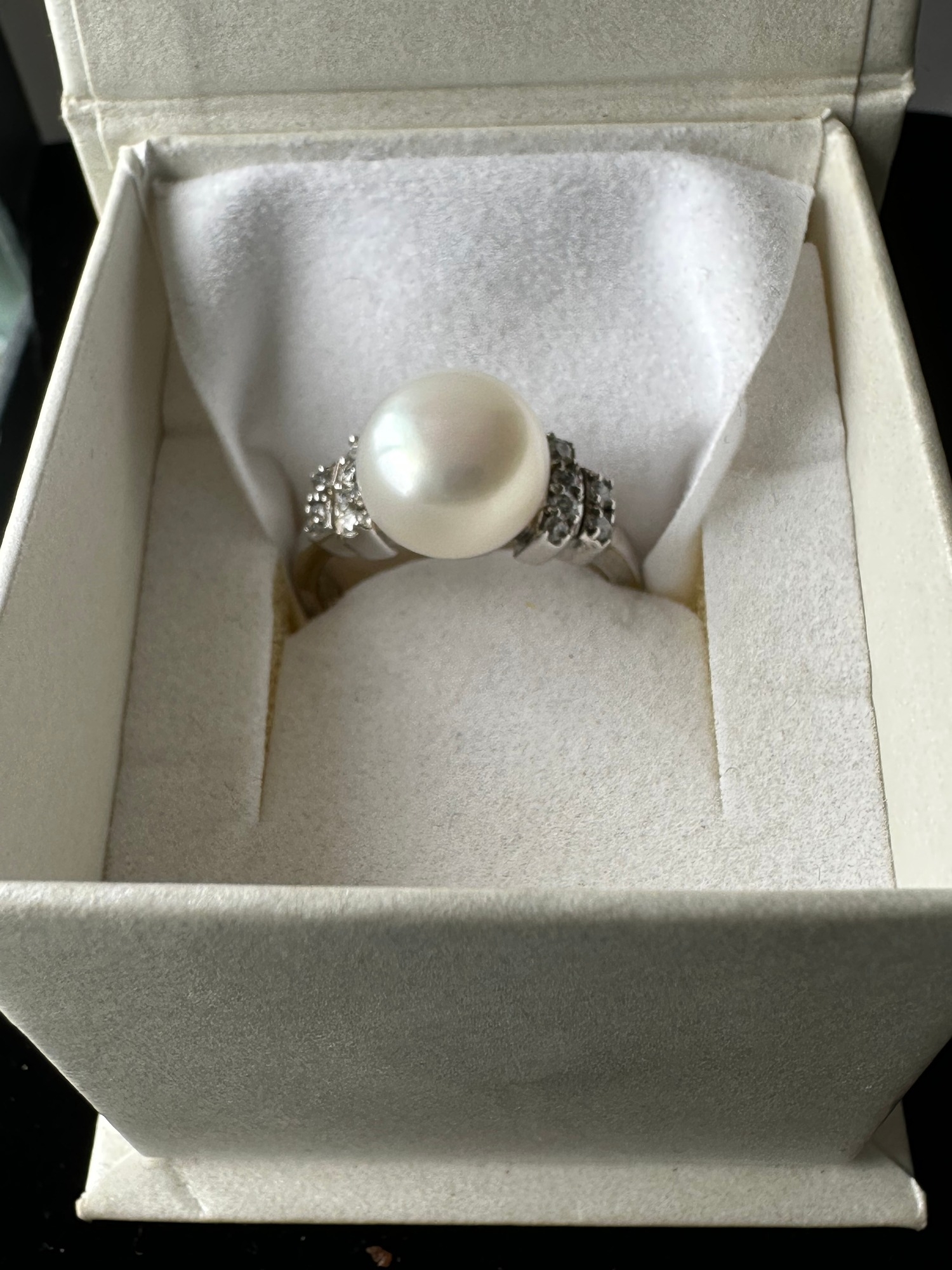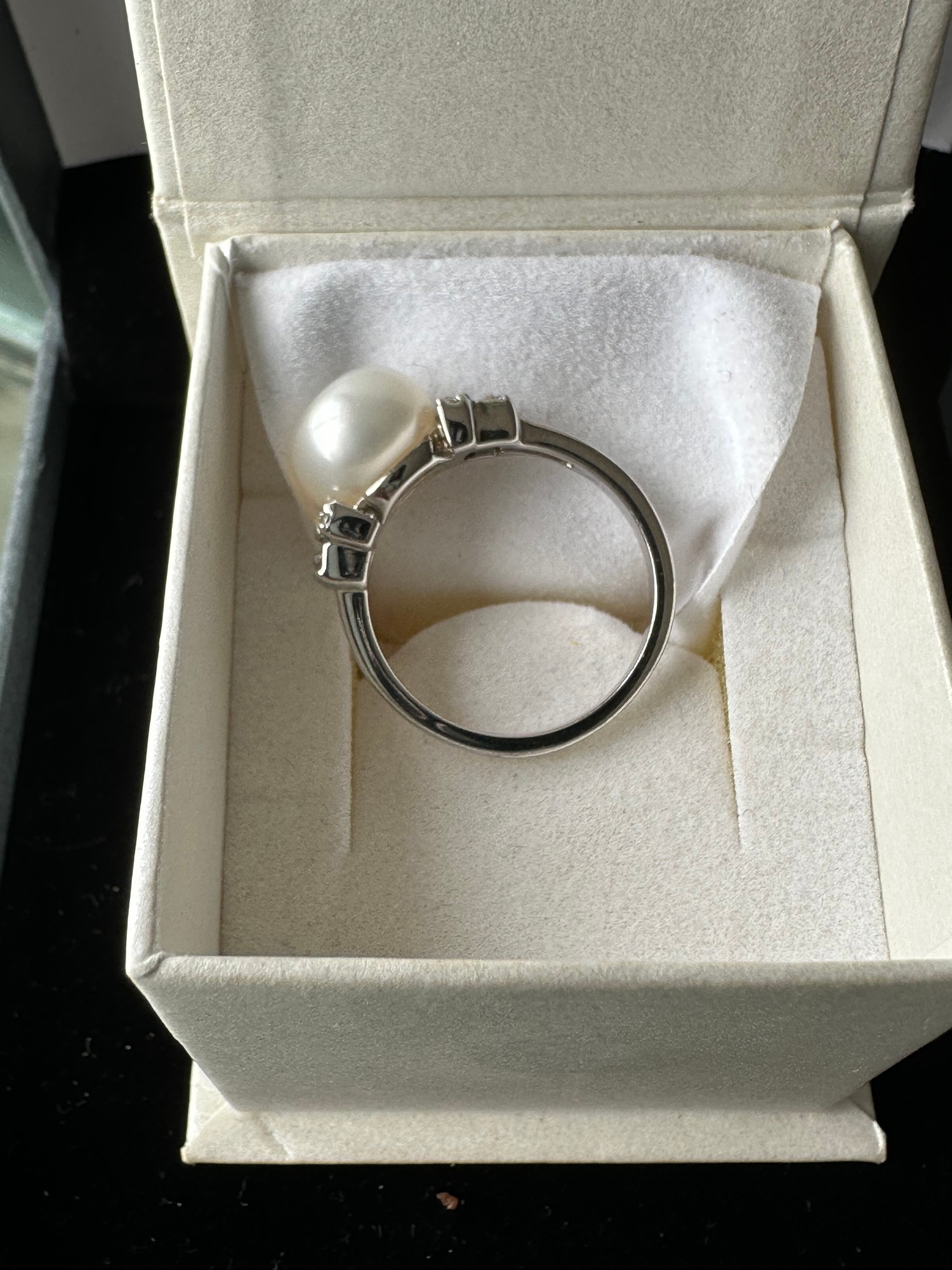 Sterling Silver rhodium plated pearl ring with CZ size N/O. In original box