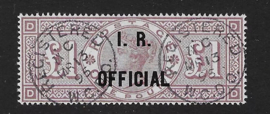 FORGERY / REPLICA / FACSIMILE of GB QV 1884 on �1 brown stamp / lilac I.R.OFFICIAL SGO12 (original would be high cat value � 30,000) a/f