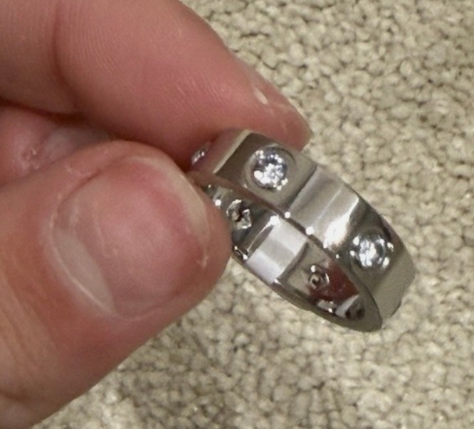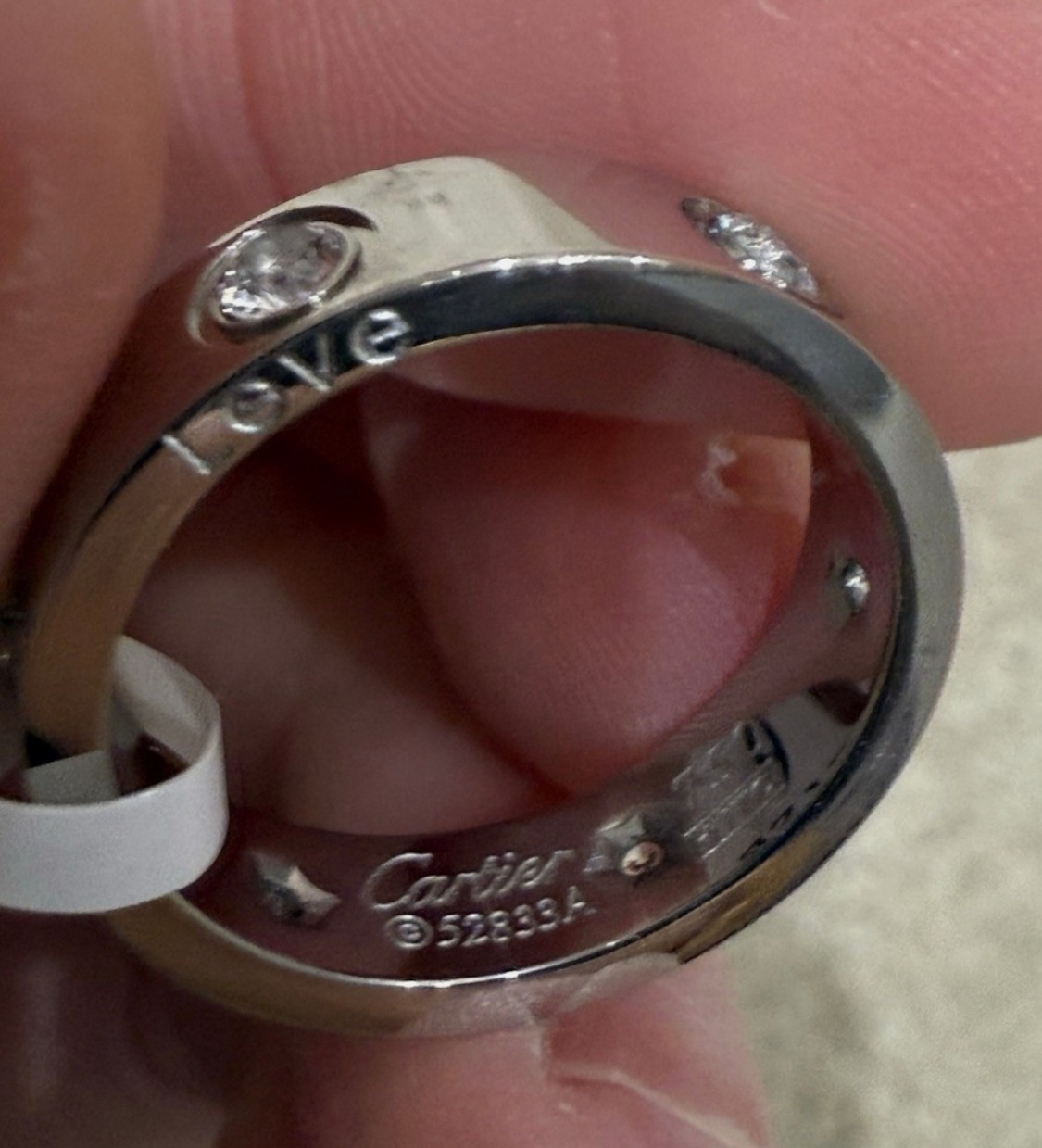 silver coloured love ring, replica, no guarantees given or implied that this is made from precious metal, 6P Faux Diamonds as found, size approx. L 1/2