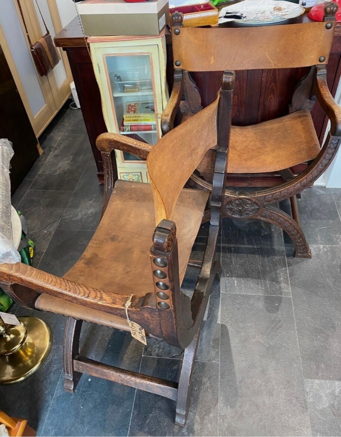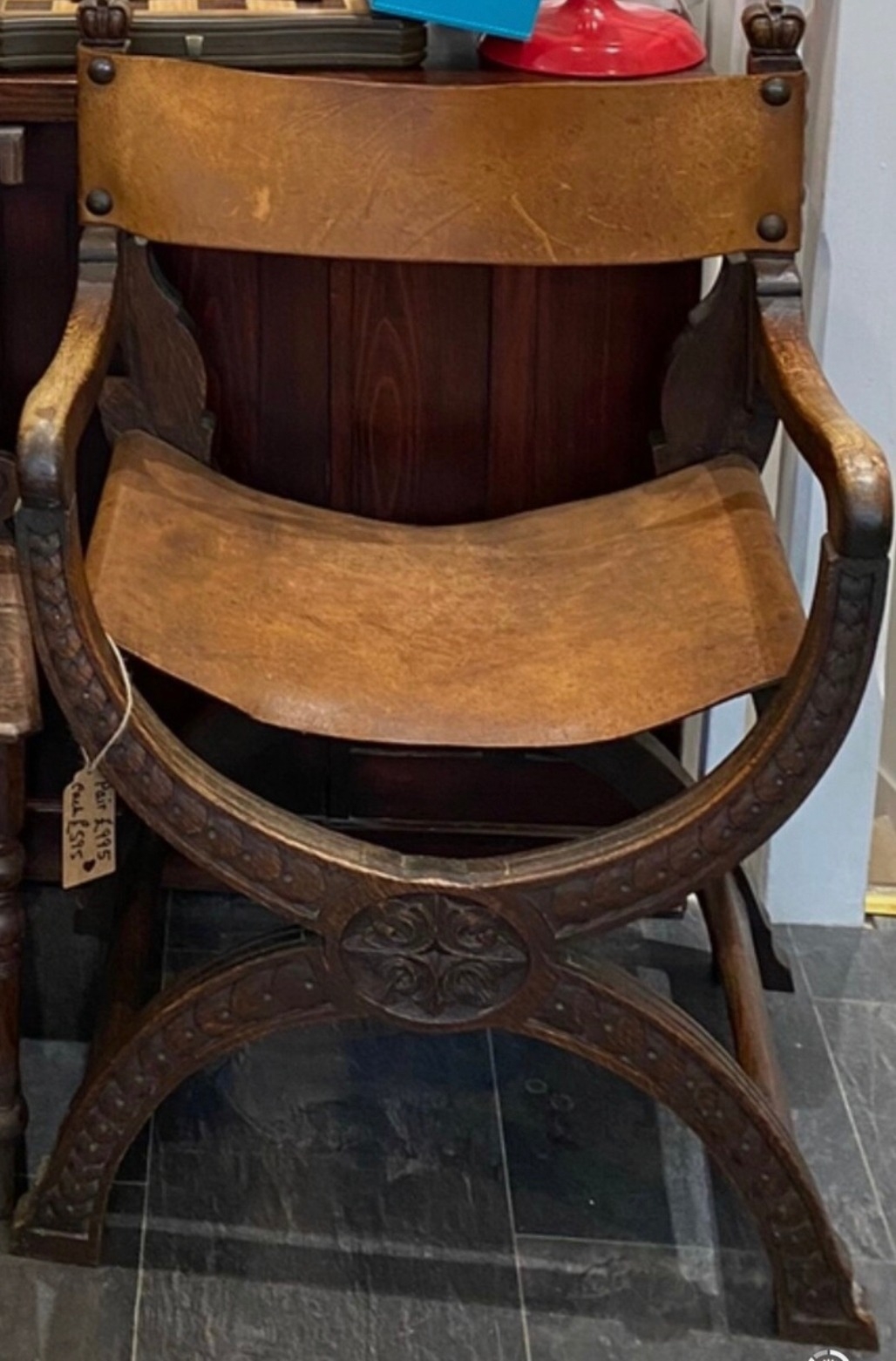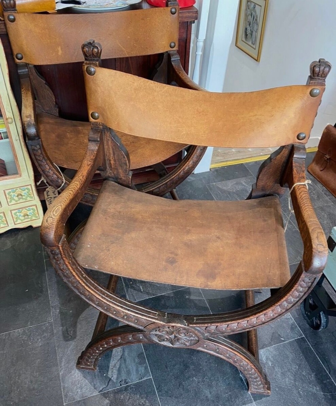 Pair of antique Savonarola chairs with leather seat and back, BUYER TO COLLECT