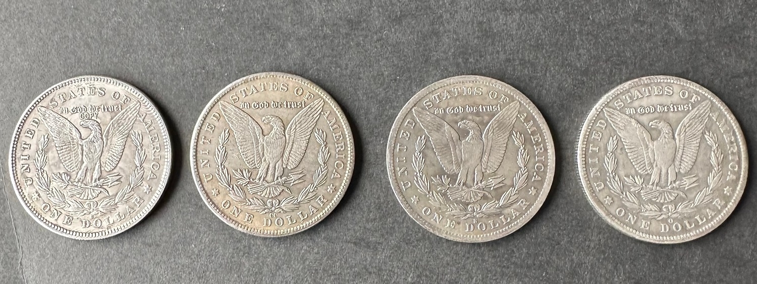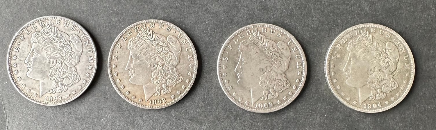 Four silver plated US Morgan dollar coins / copy 1891, 1893, 1903 and 1904