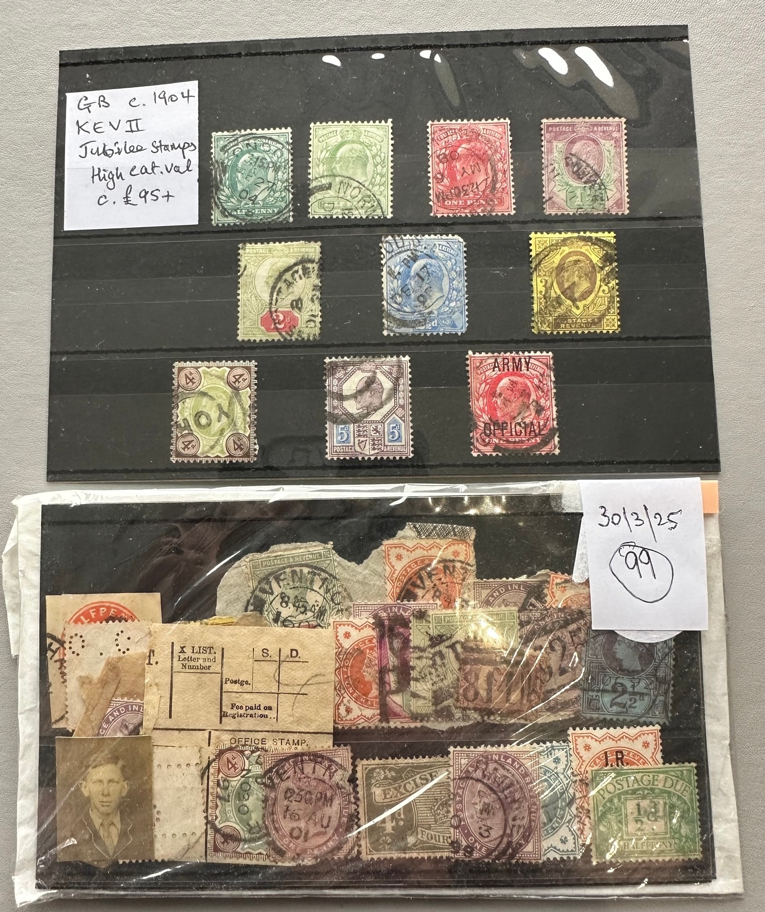 GB QV KEVII early used stamps selection / collection on stock cards inc overprints I.R. OFFICIAL, ARMY OFFICIAL. London and York bullet cancel noted, Excise and Postage Due, Bantam and perfin